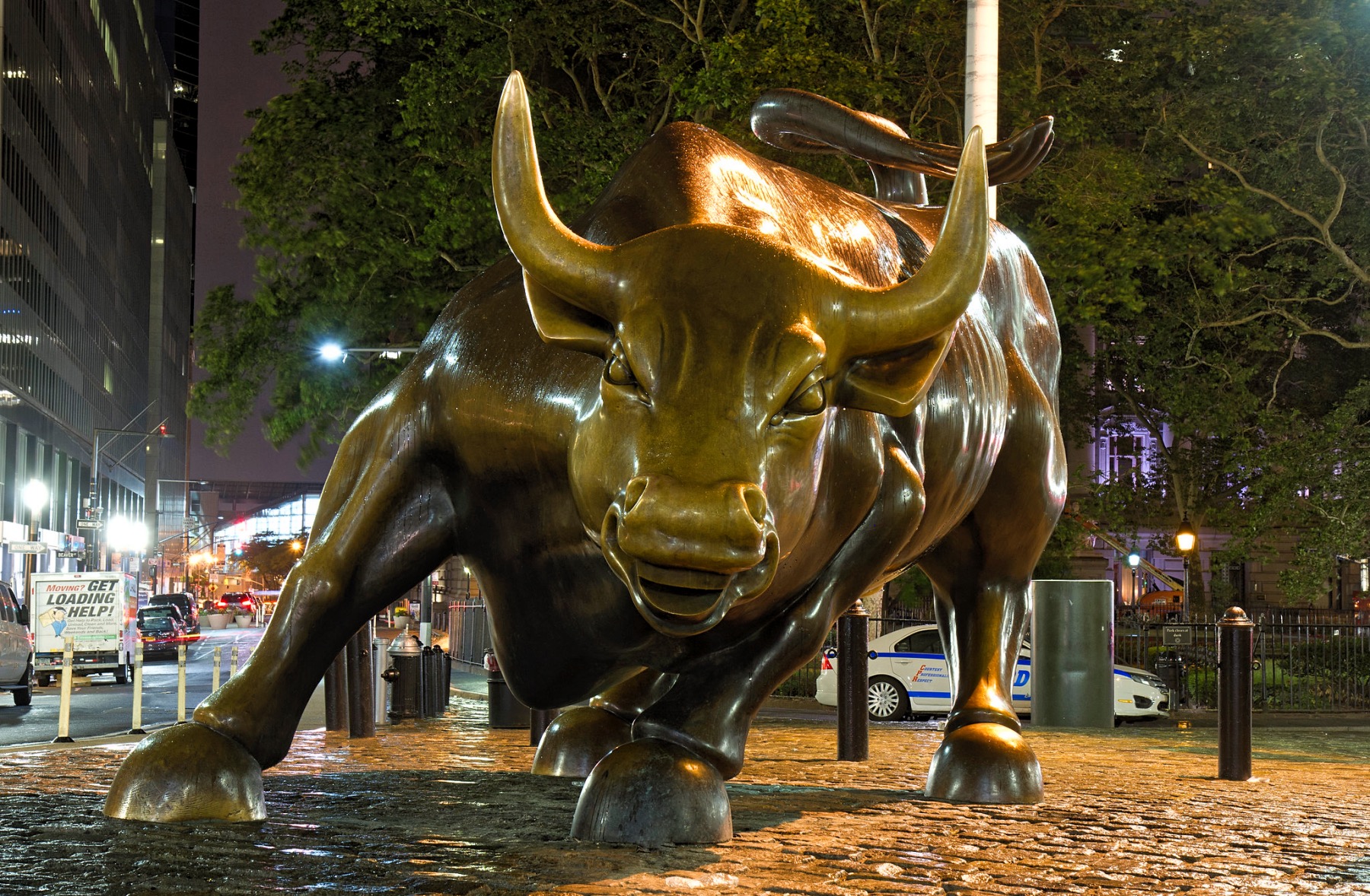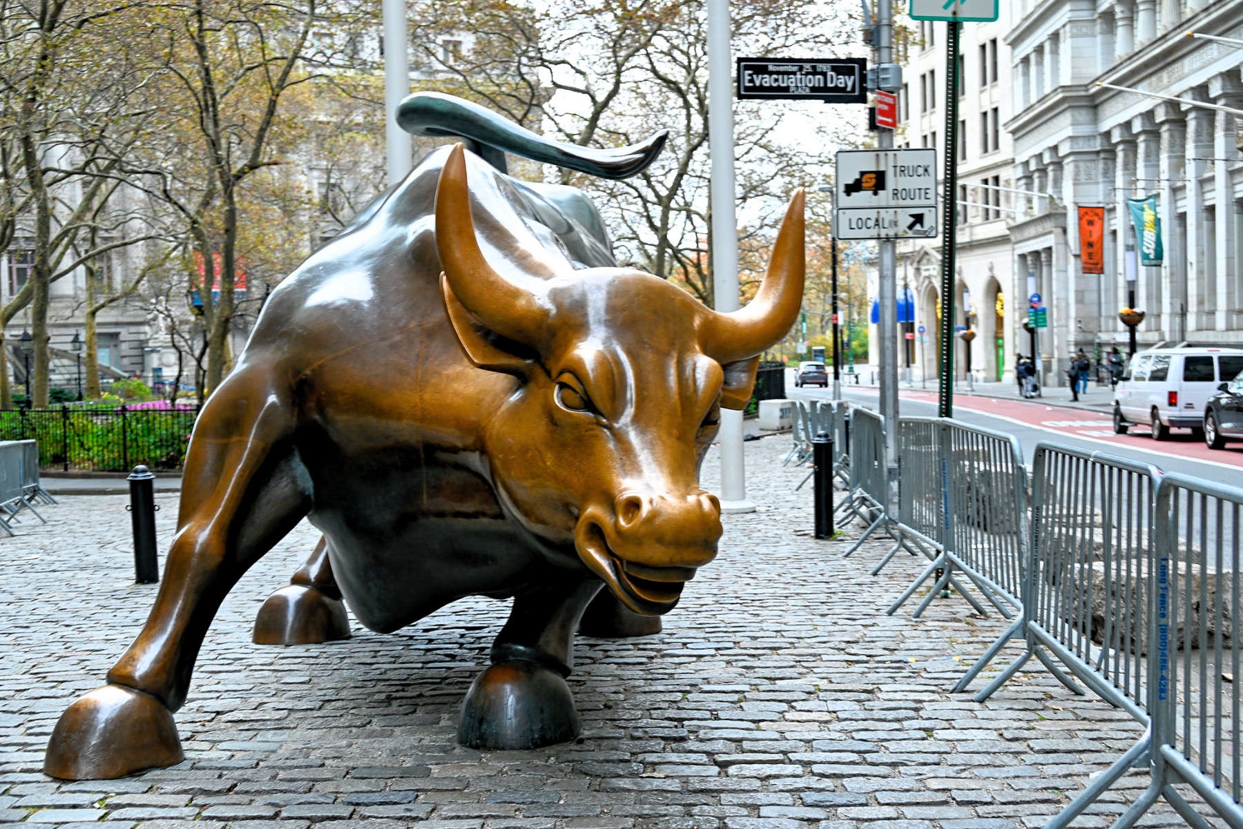 In the Financial District of Manhattan in New York City, Charging Bull is a bronze sculpture located on Broadway, somewhat north of Bowling Green. It is also known as the Bowling Green Bull or the Bull of Wall Street. The 7,100-pound bronze sculpture features a bull, a symbol of financial optimism and prosperity, and stands 11 feet (3.4 m) tall and 16 feet (4.9 m) long.