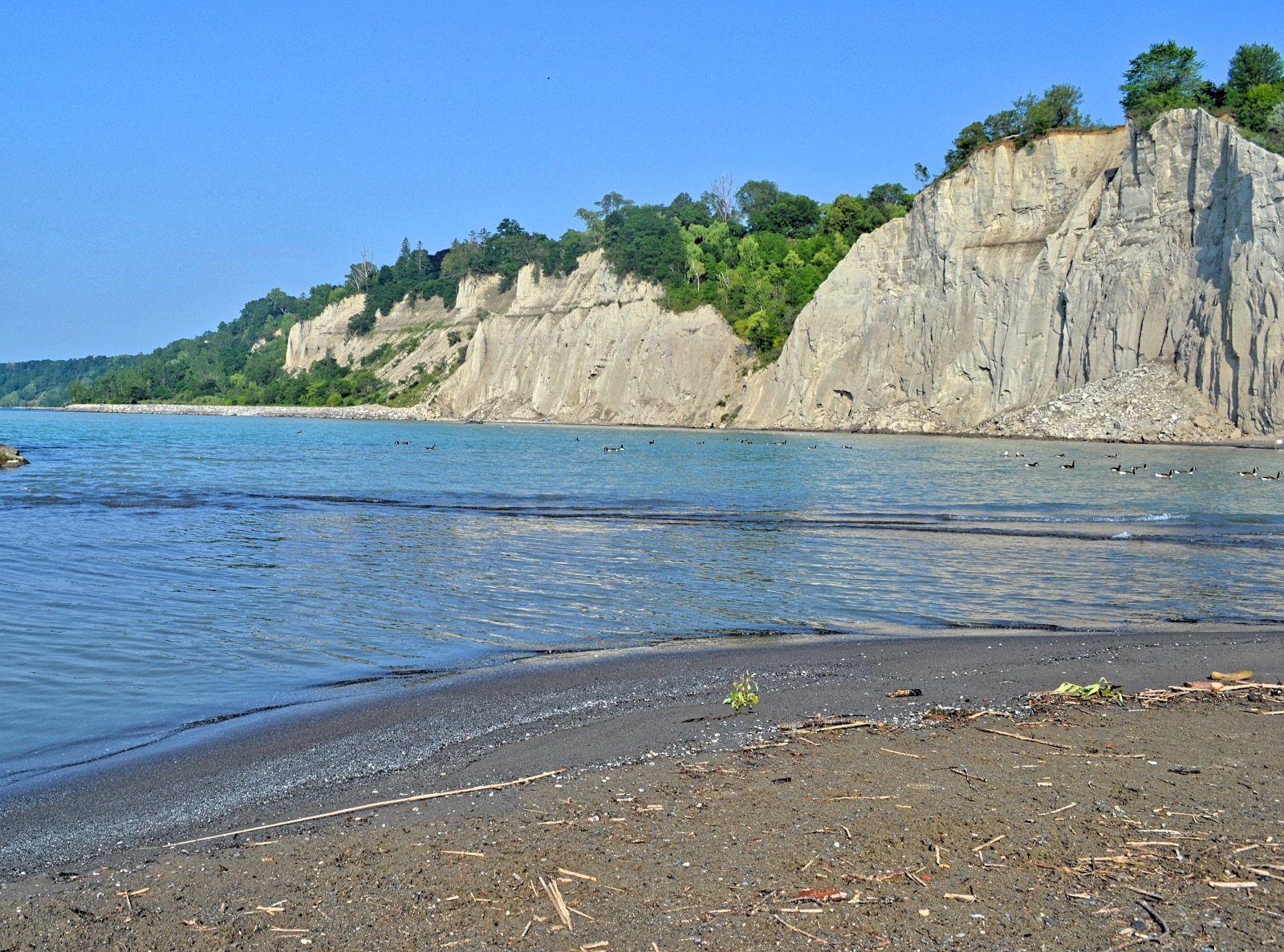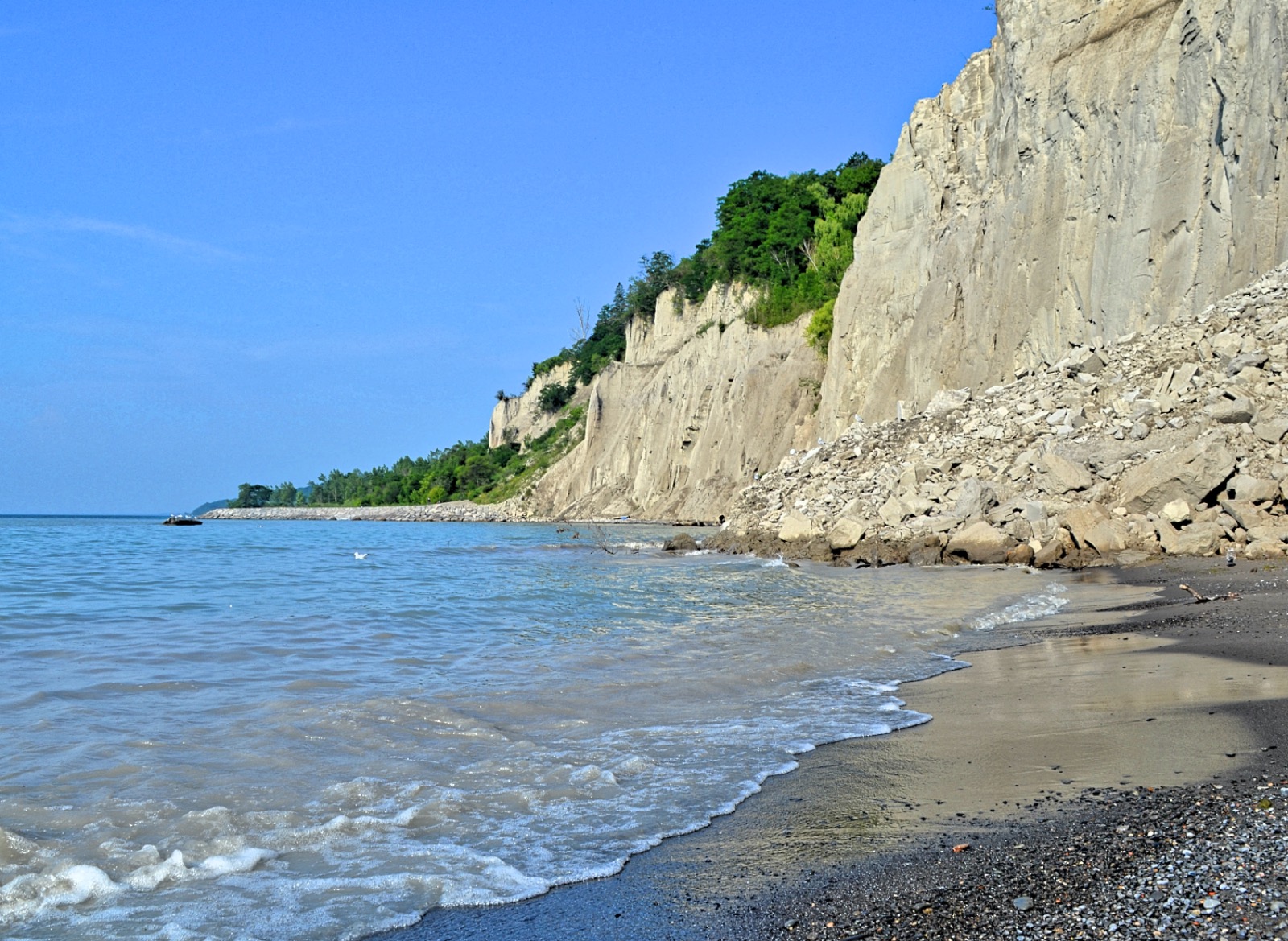 The Scarborough Bluffs are located along the coast of Lake Ontario. From the Eastern Beaches of Toronto in the west to East Point Park in the east, the bluffs reach for about 15 kilometres along the waterfront. The Scarborough Bluffs are a notable geological feature formed around 12,000 years ago by the deposition of sedimentary layers. Natural forces such as wind and water erosion from Lake Ontario shaped them.