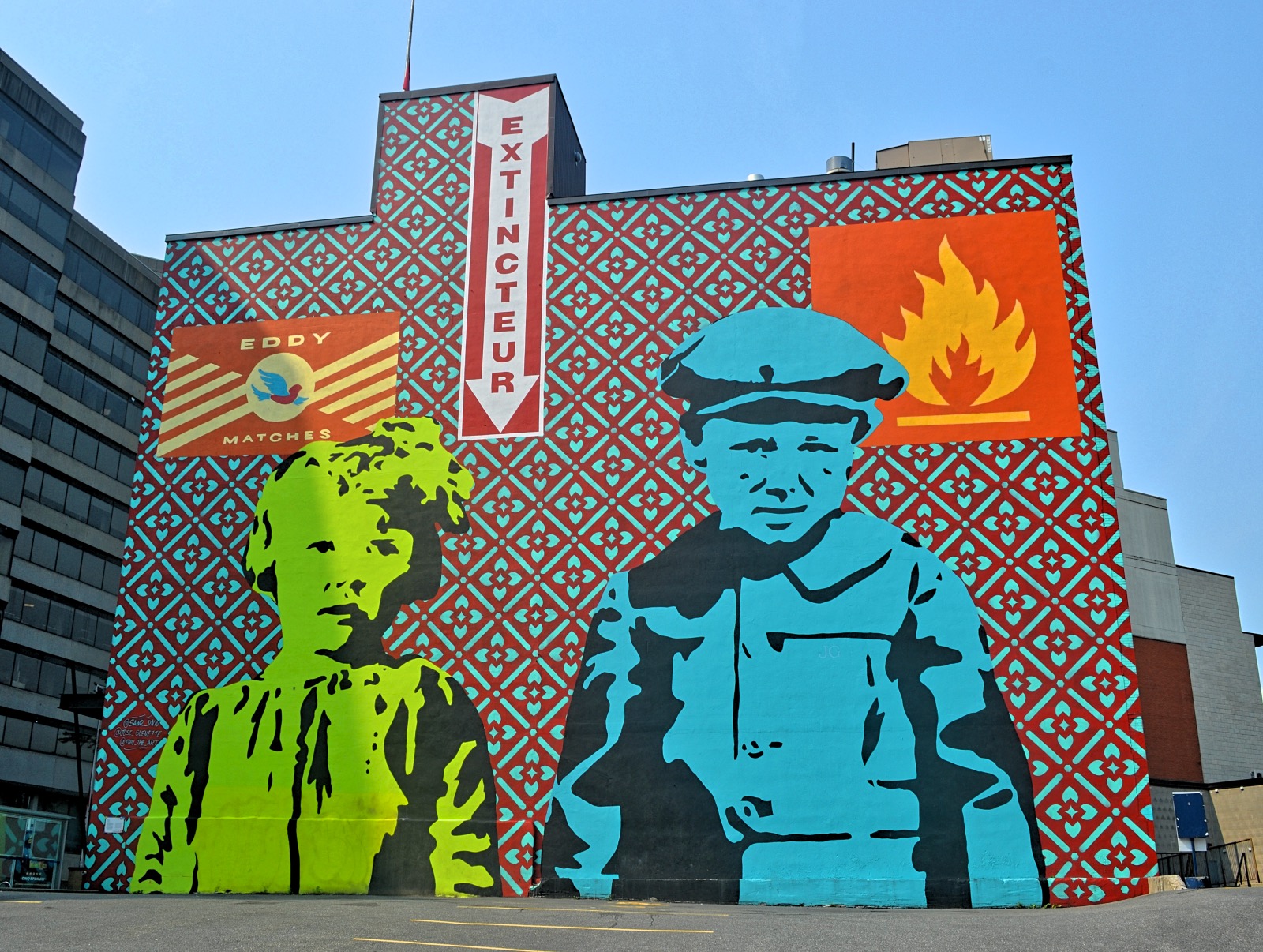 It’s tough to miss this massive artwork overlooking a parking lot near Place du Portage. It contains an image of two working-class children from the turn of the century whose father worked at the E.B. Eddy match plant, created by José Guénette, Phil Landry, and Marin Mitrasinovic. The flames near them are reminiscent of the many terrible fires that ravaged Hull at the time.