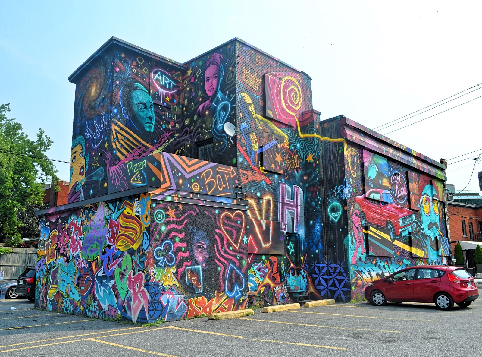 The fresco presents many bright colors, and various and varied patterns. These zigzags and squares form a whole, which gives it a psychedelic style, said Mitrasinovic. Objects, such as a stop sign, and people, including two men during the Prohibition Age, are also depicted. The mural was done with rollers and spray paint, and Landry says it took almost a month and a half of long working days.