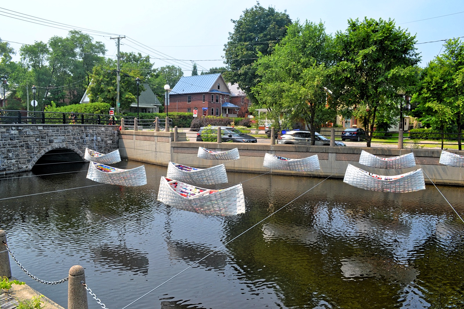 The last artwork we saw before calling it a day was the best one of all. A fleet of white woven canoes with brightly coloured interiors, hung on wires over Brewery Creek near Théâtre de l’Ile. It is called Pasage migratoire. Giorgia Volpe, a Brazilian-Canadian artist, created the piece to suggest migratory themes and to reflect Indigenous knowledge and Quebec folk tales.