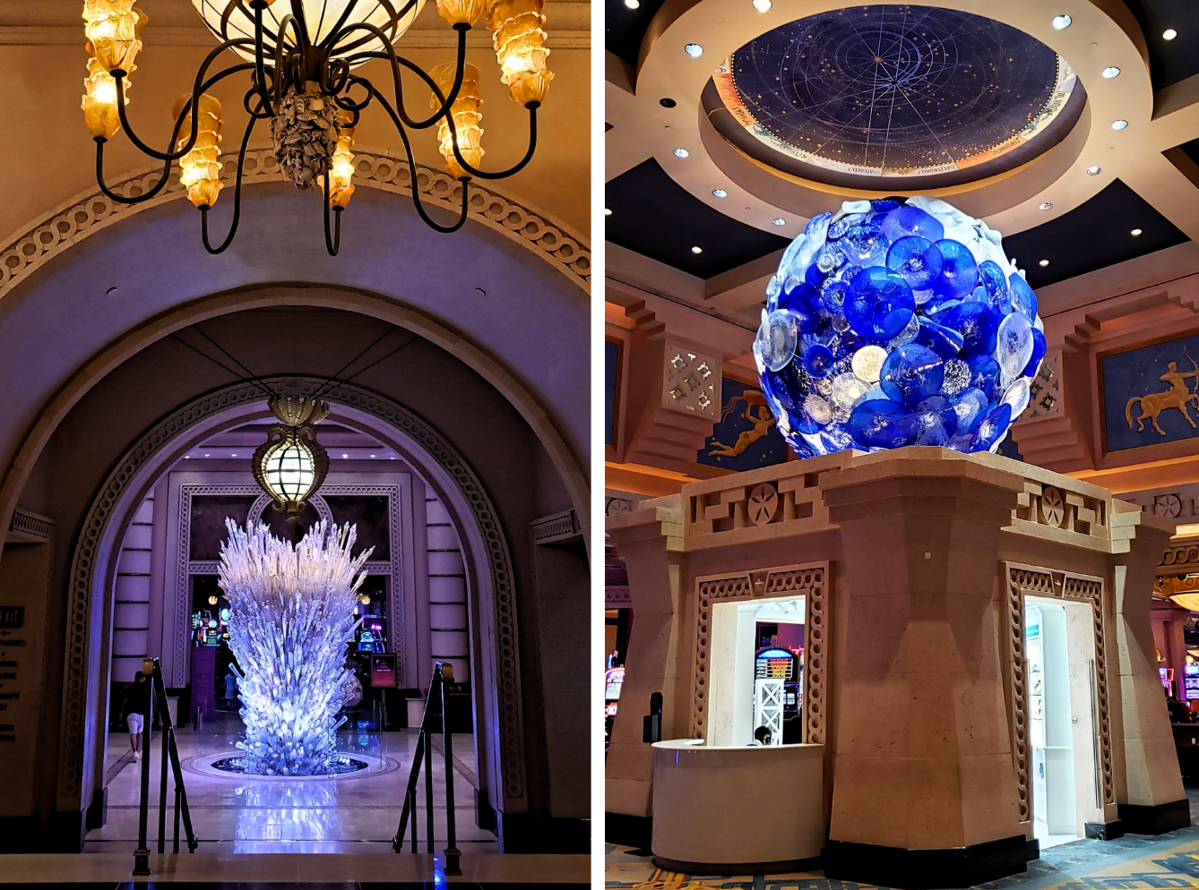 From afar the moon glistens majestically on its base but its true beauty, in my opinion, is in the details in the variance of each glass piece. The variance in the shades of each color and resultant sparkle is something just indescribable! All four sculptures were specifically commissioned for the casino and each sculpture is valued at over $1 million USD.