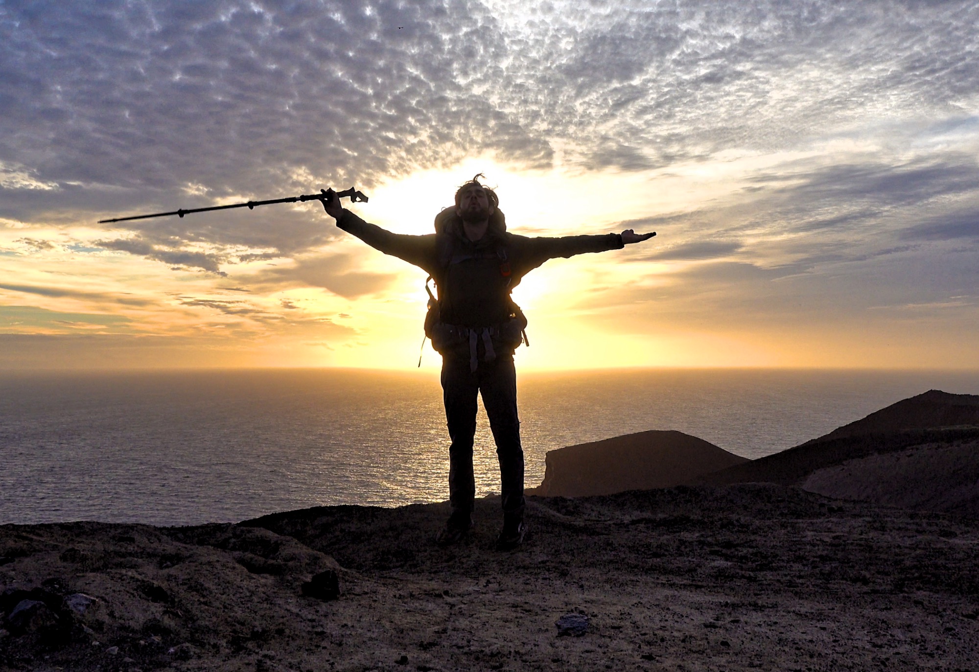 I was feeling a bit down about the weather, until… On one of the last volcanos before reaching the ocean coast, I started to see the clouds getting thinner. A boost in moral. I started hiking faster to the last volcano at the West end of the island. I was alone there with all these black rocks, dusty craters, high cliffs and the ocean. The sun started to go down and the colour it reflected on the ocean was just incredible.