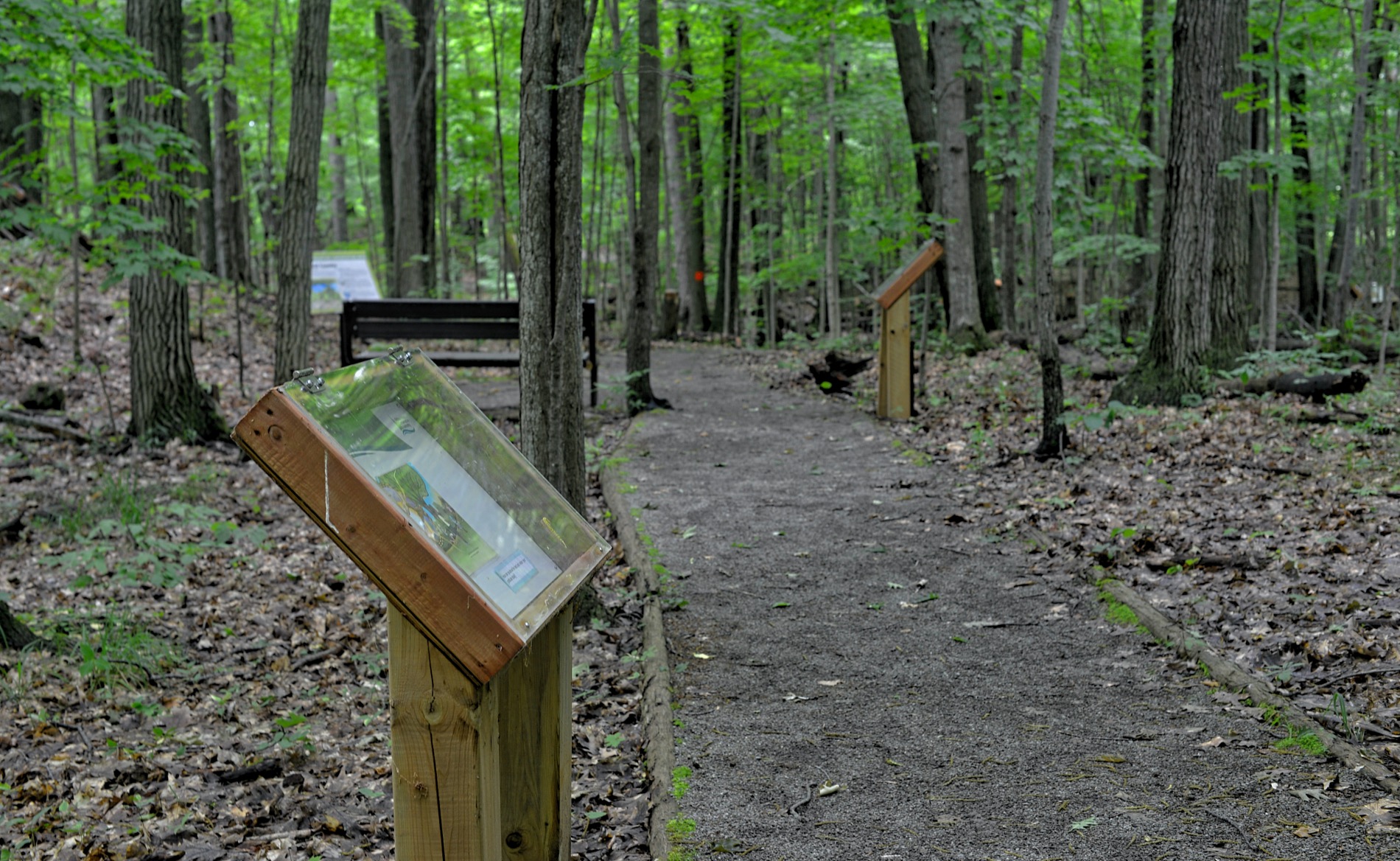 On the map, this is referred to as the Mobility trail. It’s a wheelchair-accessible trail with a bed for infirm walkers. There are some pleasant views of the lake as it winds through a mixed forest.