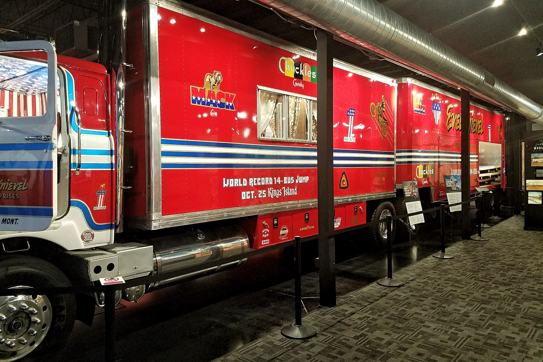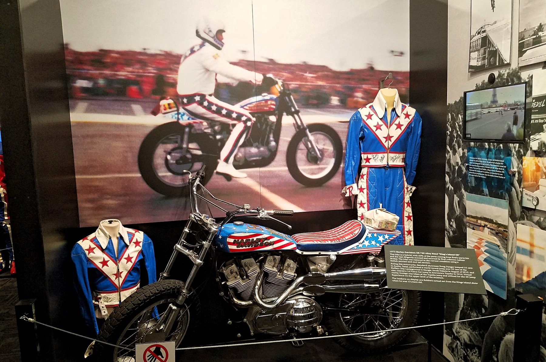 In Topeka, Kansas, in the United States, there is a non-profit museum called the Evel Knievel Museum. With interactive exhibits, the museum has the world’s greatest collection of genuine Evel Knievel memorabilia. It has two levels and 13,000 square feet. The museum opened in June 2017 and is next to the Historic Harley-Davidson in Topeka.