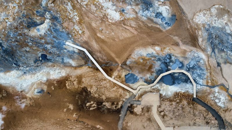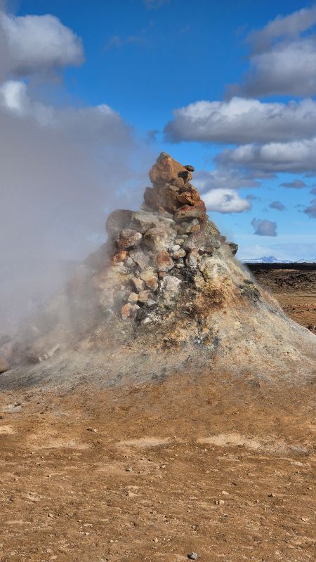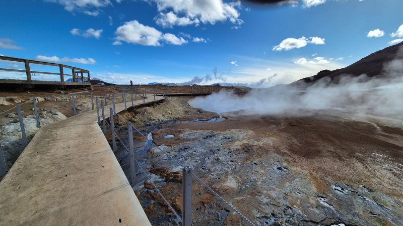Hverir, also known as Námafjall Geothermal Area, is a striking geothermal field located near Lake Mývatn in North Iceland, just off Route 1. This otherworldly landscape features steaming fumaroles, bubbling mud pots, and vividly colored mineral deposits, all set against the backdrop of the reddish slopes of Mount Námafjall. The area is characterized by a strong sulfur smell due to the geothermal activity, and the ground is largely devoid of vegetation because of the acidic soil.