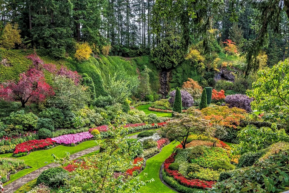 The Butchart Gardens are a collection of floral display gardens situated close to Victoria on Vancouver Island in Brentwood Bay, British Columbia, Canada. Every year, more than a million people visit the gardens. The gardens have been recognized as a Canadian National Historic Site. Mr. Butchart gathered ornamental birds from all over the world, keeping peacocks on the front lawn, ducks in the Star Pond, and a parrot inside the home while Mrs. Butchart collected flora.